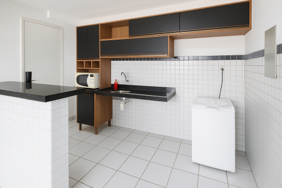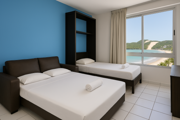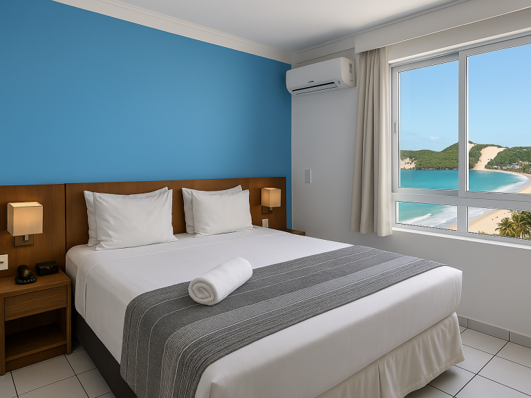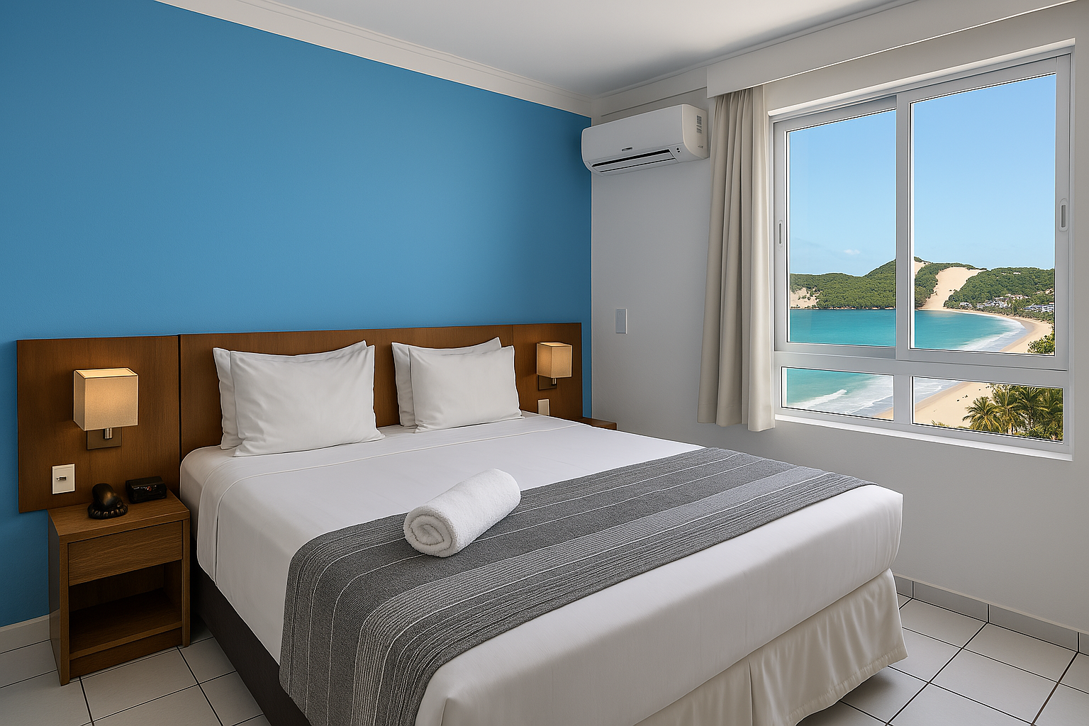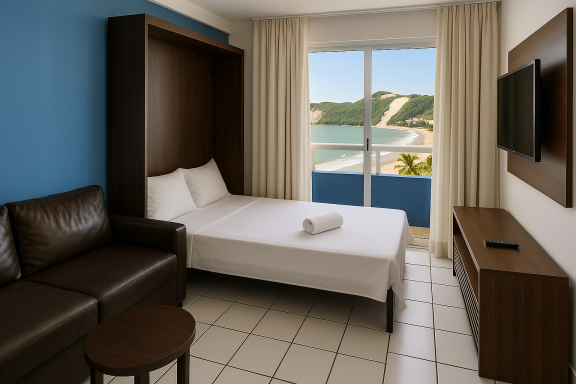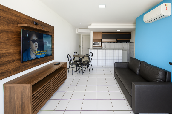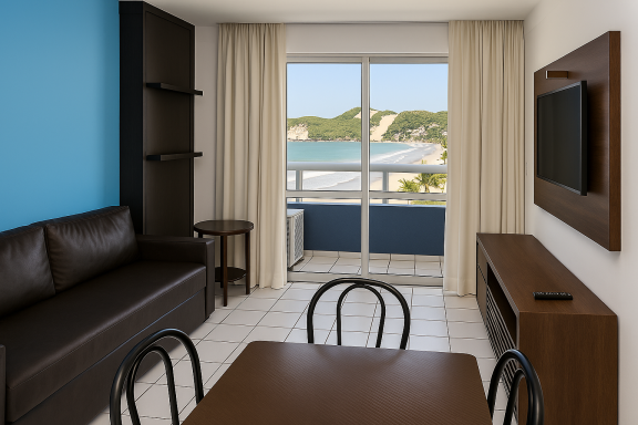 Apartamento de luxo no Ponta Negra Beach., com ampla sala de estar e TV grande com canais a cabo, Playstation 3, sofá-cama espaçoso, cama embutida e mesa com 4 cadeiras. A suíte possui uma cama king e TV a cabo. A cozinha tem micro-ondas, cafeteira, sanduicheira, liquidificador e geladeira. Garagem e Wifi