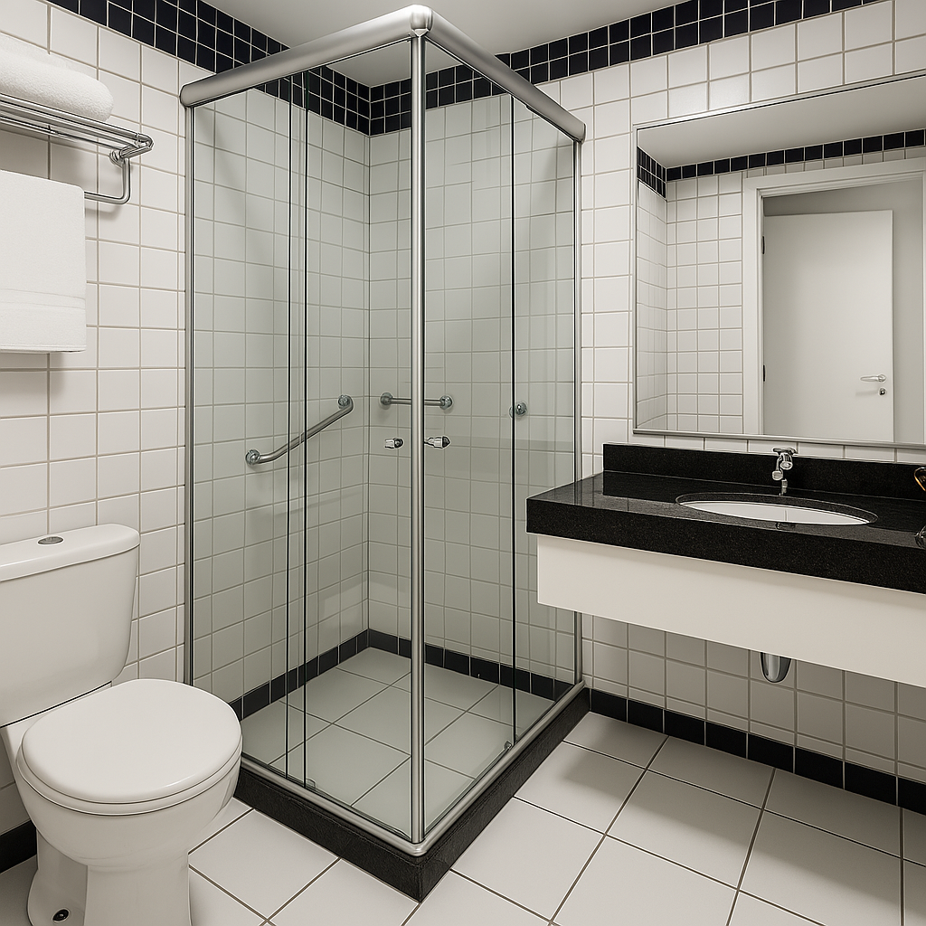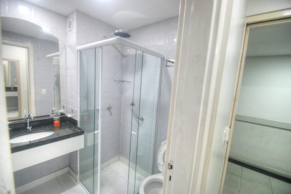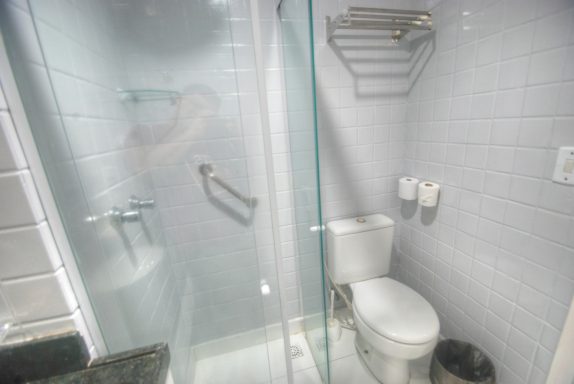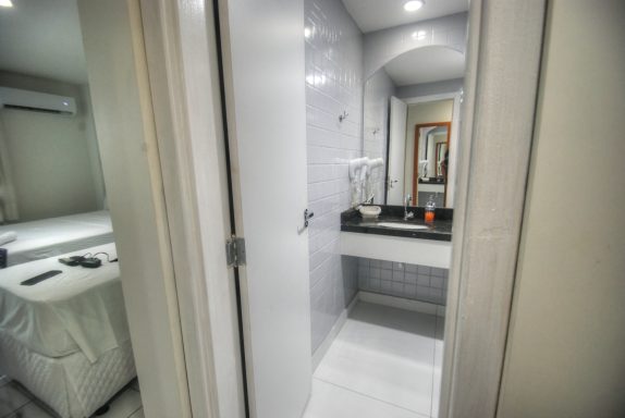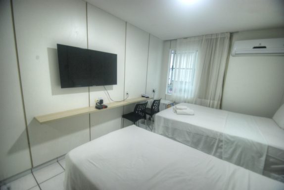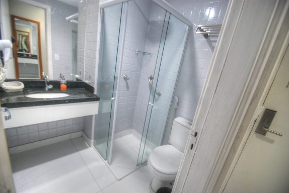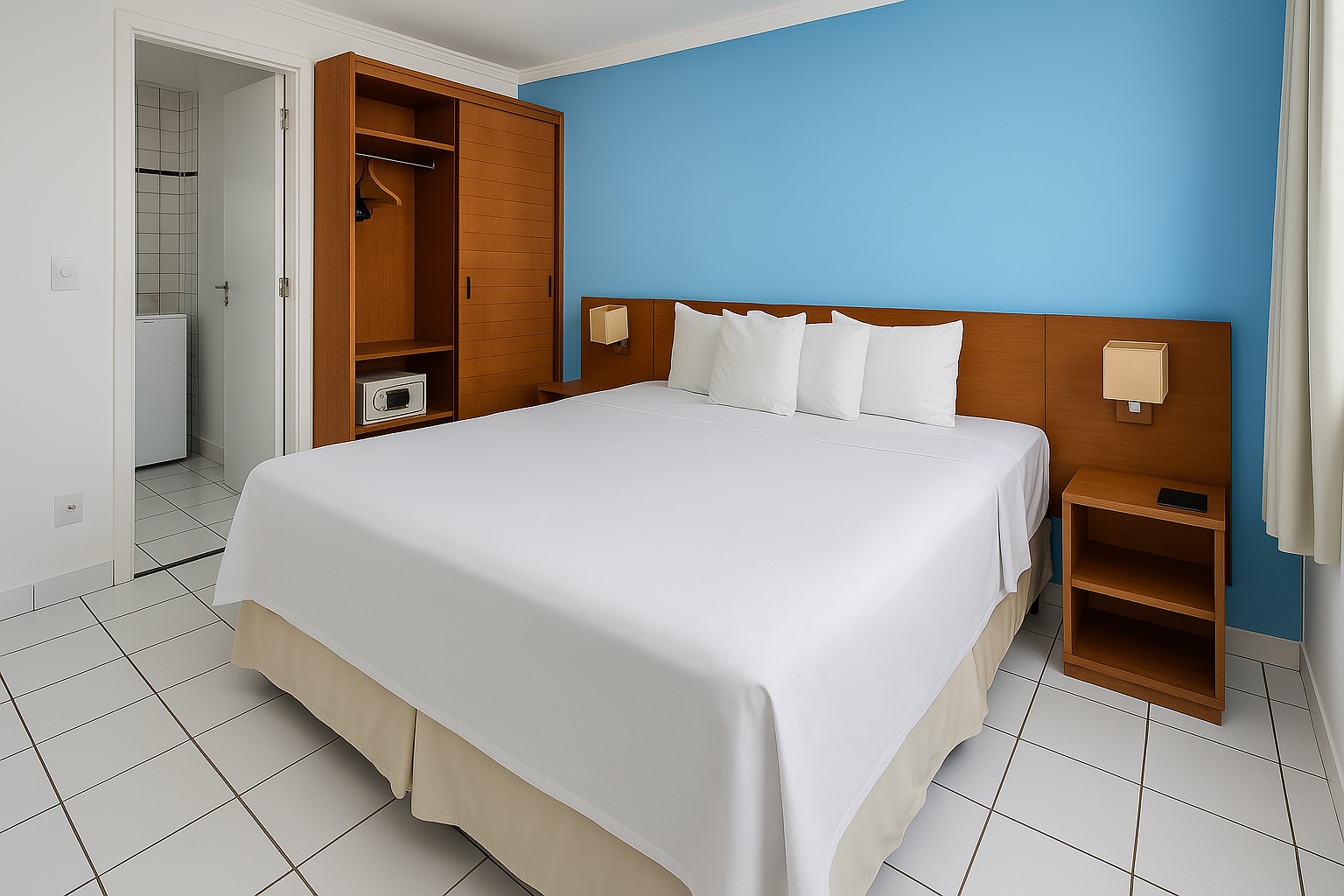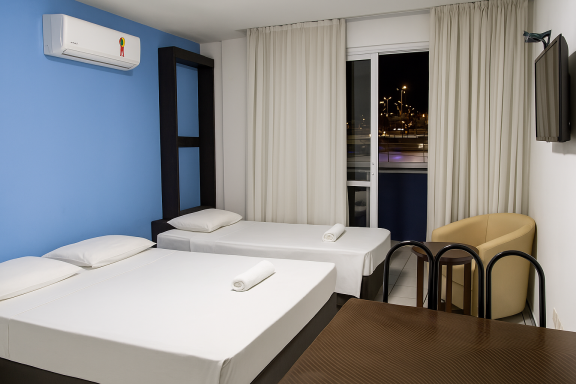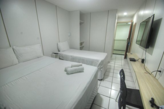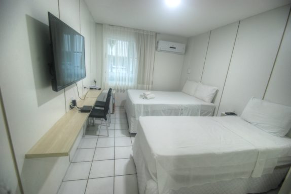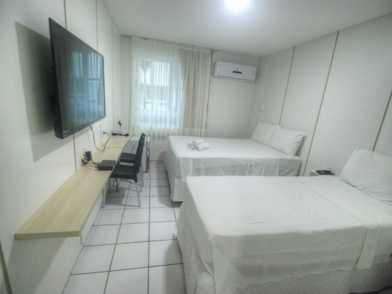 Apartamento com cama Queen e cama de solteiro, escritorio, minibar, cofre, TV a cabo e Wifi, banheiro com agua quente com box.